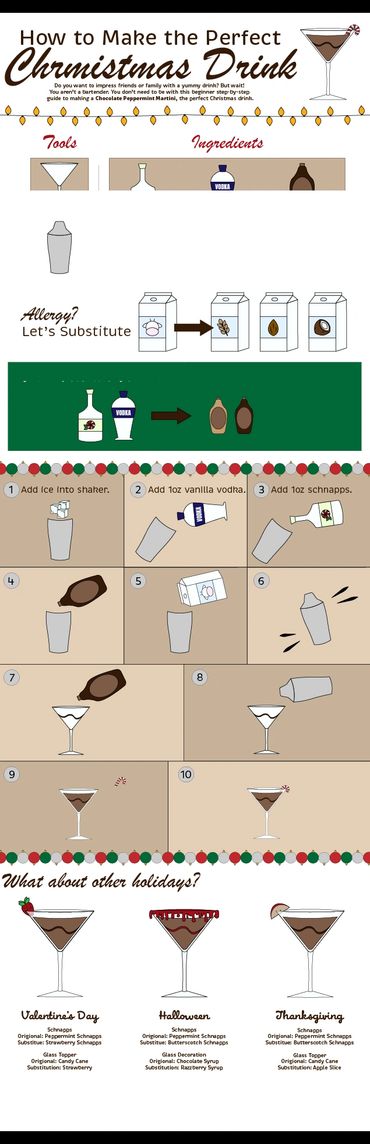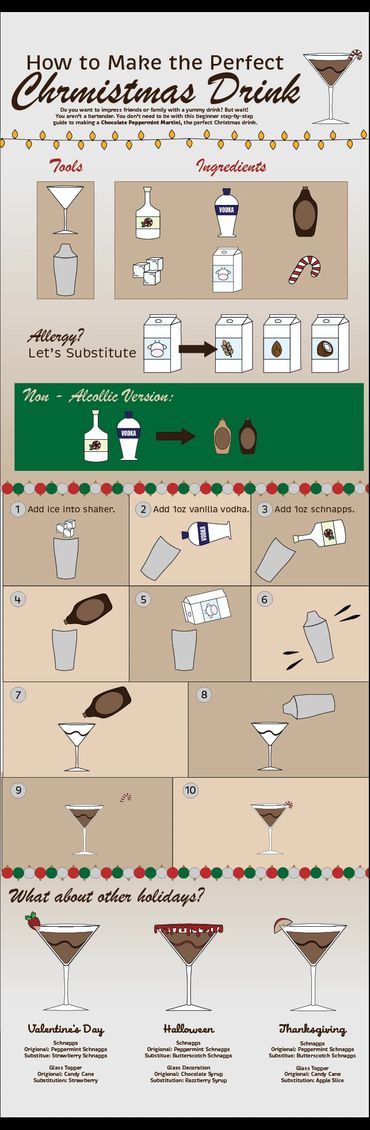 The design uses clear visuals to guide the viewer through each step of the drink-making process. The ingredients, such as vanilla vodka, peppermint schnapps, and chocolate syrup, are listed alongside the necessary tools like a martini glass and shaker. The infographic also suggests creative substitutions for other holidays: swapping out peppermint schnapps for butterscotch schnapps for Halloween or strawberry schnapps for Valentine’s Day.